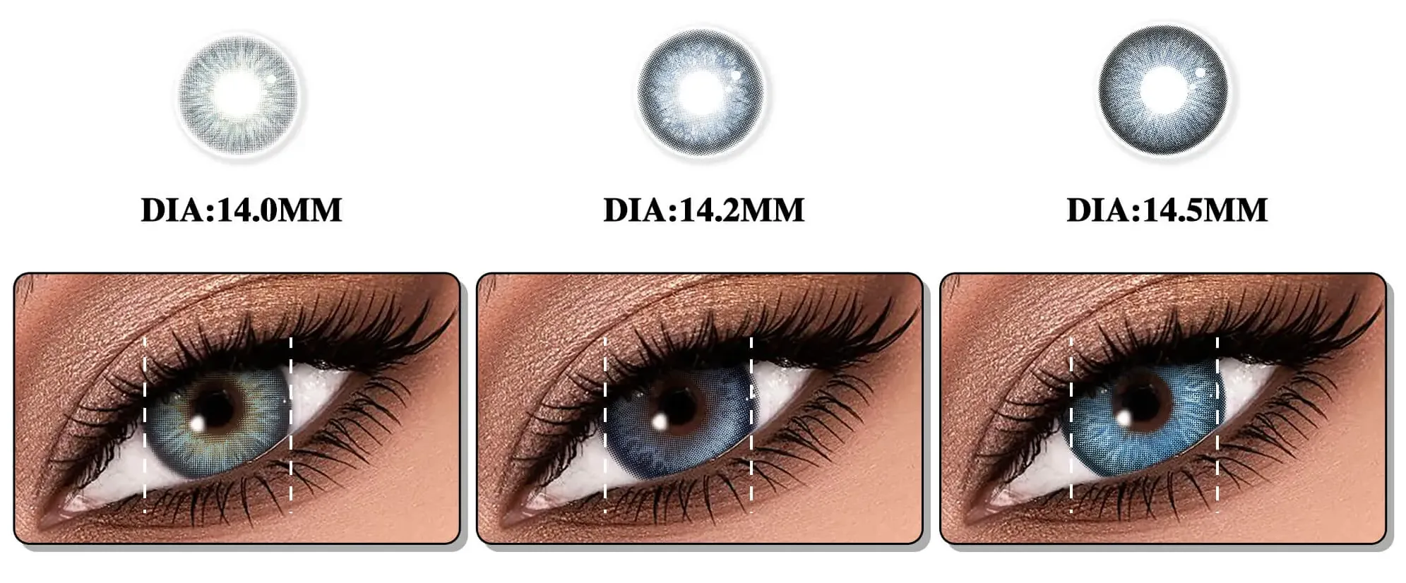Generally, the part of the pupil of the colored lenses for everyday use is not covered. In other words, no matter where you buy colored soft lenses, the middle part of the lens (where your pupil is) is transparent and this part will not be included in the tinting, otherwise it will cover your whole vision and you will be blind. That said, the size of the Graphic diameter of the lens is directly related to the effect of the tint range when the lens is worn. For example, if the lens diameter is 14.2mm, the larger the Graphic diameter, The greater the effect of dilating the pupils when viewed visually. The next picture will show you the visual difference between different lens diameters.