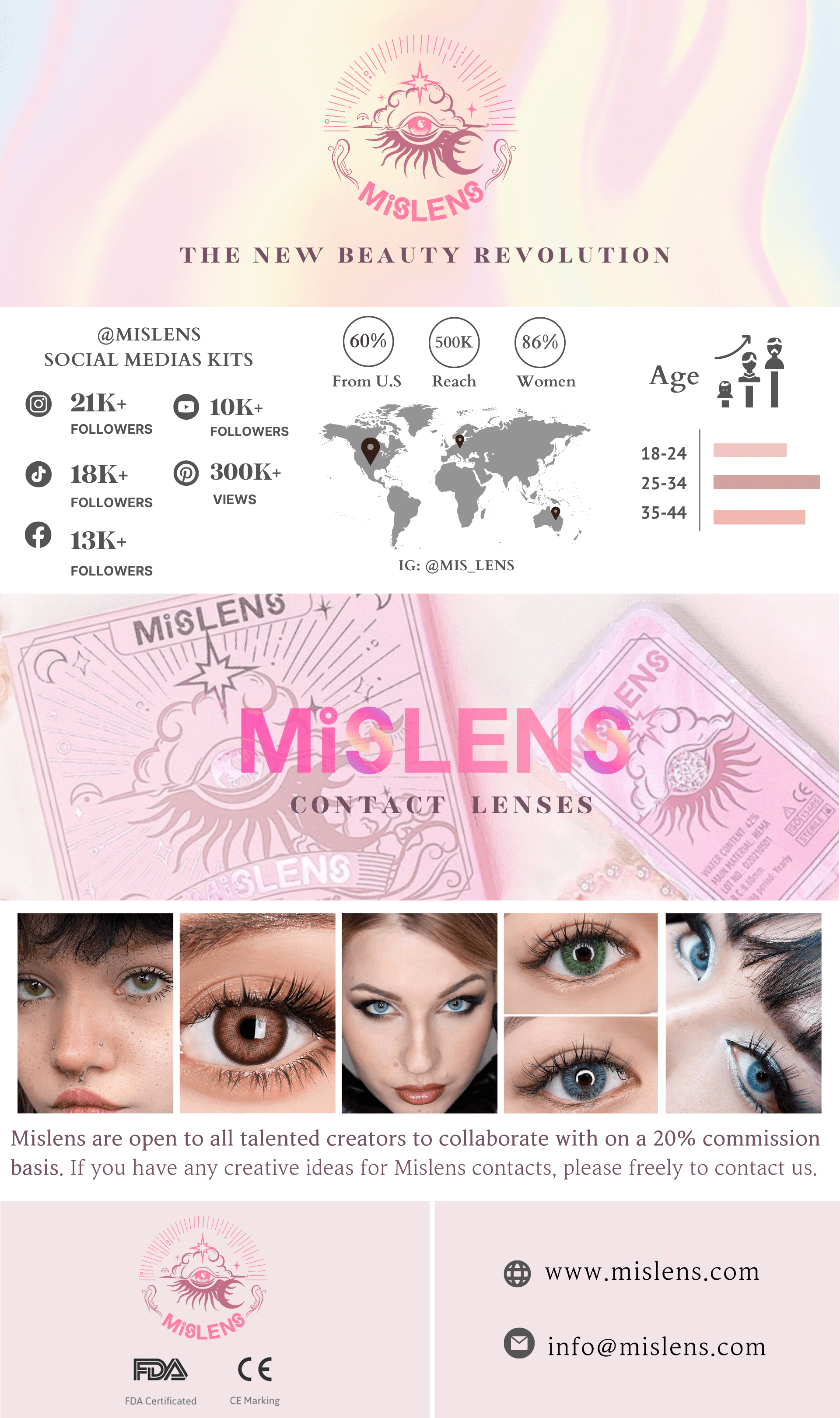 Mislens is committed to providing a unique selection of cosmetic-colored contact lenses at trusted quality and price. Mislens has created a fashion portfolio: "The New Beauty Revolution" that connects make-up and make-up contact lenses to help our clients express who they are from within.